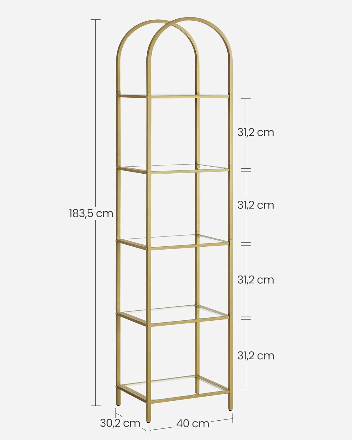 - Koe säilytysratkaisu, joka nostaa kokoelmasi uusiin korkeuksiin. 5-tasoinen kultainen kirjahyllymme on vaikuttava ja tyylikäs tapa esitellä aarteitasi. Elegantti kaareva yläosa ja läpinäkyvät lasihyllyt, joita ympäröi hohtava kultainen teräs, luovat ylellisen ja katseenvangitsevan esityksen.