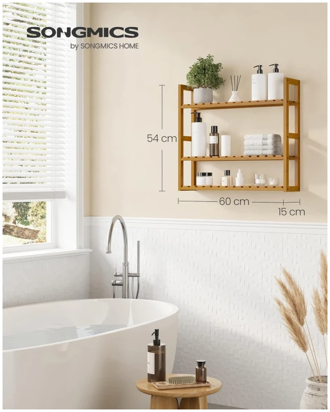 Kylpyhuonehylly lattia- tai seinäkiinnitykseen, 3 säädettävää hyllytasoa – 60 x 15 x 54 cm, bambu