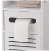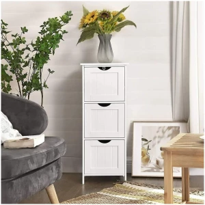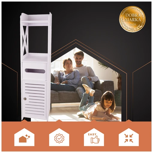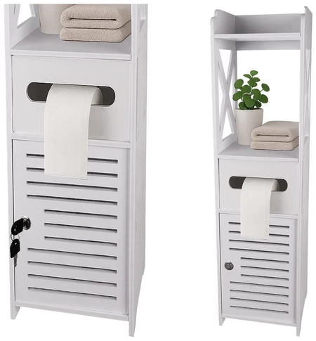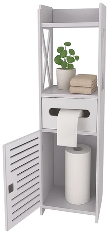 Tilaa säästävä pylväsmuoto: Kapean ja korkean rakenteensa ansiosta kaappi sopii ahtaisiin tiloihin ja tarjoaa runsaasti piilotettua säilytystilaa WC-paperille, pyyhkeille, kosmetiikalle tai puhdistusaineille.