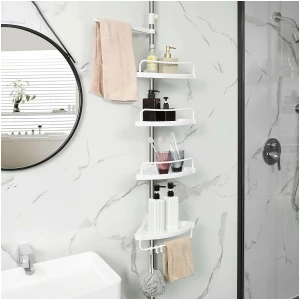 Kylpyhuoneen kulmahylly – Suihkuhylly 4 koria, koukut, pyyhetanko Korkeus 95-300 cm